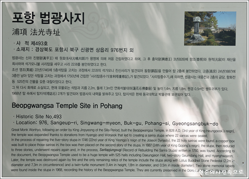 포항 법광사지는 비학산에 소재한 절터로, 이 사찰에 대한 명칭과 위치는 조선시대의 지리문헌인 『신증동국여지승람』과 『동경잡기』를 통해 확인할 수 있다. 법광사지의 창건과 관련된 정확한 사료는 남아있지 않으나, 석가불사리탑 내에서 발견된 탑지석에 나온 기록을 통해 통일신라 제46대 문성왕대에 이 사찰이 번창하였다는 사실을 짐작할 수 있다.