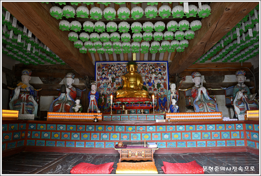건물 안쪽은 천장의 뼈대가 그대로 드러나 있는 연등천장으로 되어 있으며 기둥이 없어서 넓어 보이는 공간에 천불지장보살좌상과 시왕상(十王像)을 모시고 있다.
