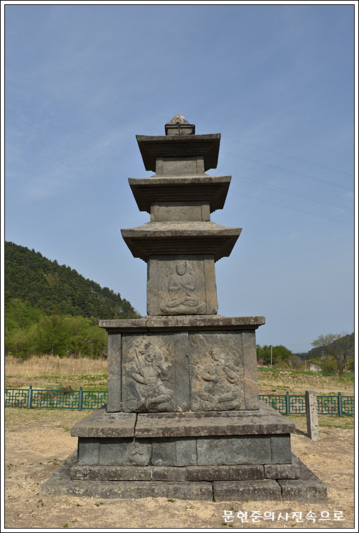 탑은 통일신라의 일반적인 모습으로, 2단의 기단(基壇)위에 3층의 탑신(塔身)을 올려 놓은 모습이다. 아래층 기단에는 날아갈 듯한 옷을 입은 천인상(天人像)이 있으며, 위층 기단에는 구름위에 앉아 무기를 들고 있는 웅건한 모습의 8부신중(八部神衆)이 있다. 탑신의 몸돌과 지붕돌은 각각 하나의 돌로 만들어졌는데, 1층 몸돌에는 각기 다양한 모습의 불상 조각들이 있다. 지붕돌은 처마의 네 귀퉁이가 살짝 치켜 올려져 있어 경쾌한 아름다움을 보여주며, 밑면에는 5단씩의 받침을 두었다. 3층 지붕돌 꼭대기에는 받침돌만 남아있을 뿐 머리장식은 모두 없어졌다.