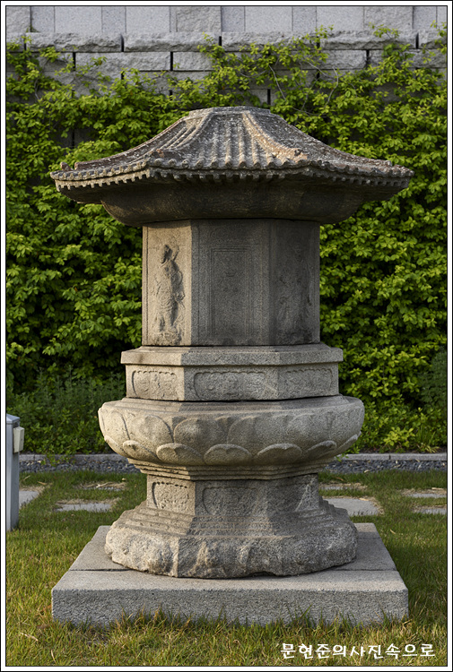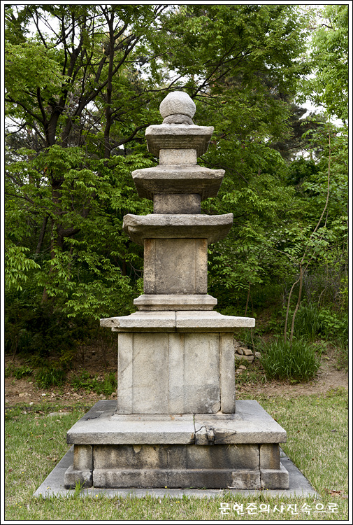 기단(基壇)은 네모난 바닥돌을 깐 후에 8각의 아래받침돌을 놓고, 그 위로 엎어놓은 연꽃무늬가 새겨진 높직한 괴임을 두어 가운데받침돌을 올린 후 다시 윗받침돌을 얹어 놓은 모습이다. 가운데받침돌에는 구름을 타고 있는 용이 섬세하게 조각되어 있고, 윗받침돌에는 아래와 대칭되는 솟은 연꽃무늬가 새겨져 있다.
