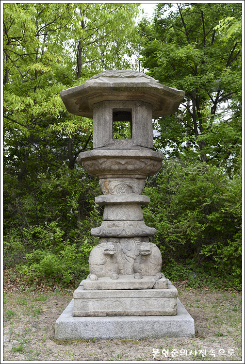 직사각형의 바닥돌 4면에 둥글넓적한 모양의 안상(眼象)을 새기고, 아래받침돌 대신 2마리의 사자를 앉혀 놓았다. 사자는 좌우에서 앞발을 내밀고 웅크리고 있으며, 등 위로 구름이 솟아올라있다. 가운데받침돌에는 구름무늬를 돋을새김하였고, 윗받침돌에는 연꽃을 새겼다. 그 위에 놓인 화사석은 4면에 창을 뚫었다.