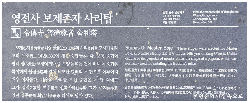 보제존자(1320∼1376)는 여주 신륵사에서 입적한 나옹화상으로, 신륵사에 그의 사리탑이 남아 있으나 제자들에 의해 영전사에도 따로 사리탑을 세운 것이다.