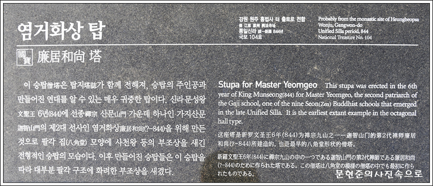 통일신라 말의 승려 염거화상의 사리탑이다. 염거화상(?∼844)은 도의선사의 제자로, 선(禪)에 대한 이해가 거의 없었던 당시 주로 설악산 억성사에 머물며 선을 널리 알리는데 힘썼다. 체징에게 그 맥을 전하여 터전을 마련한 뒤 문성왕 6년(844)에 입적하였다.