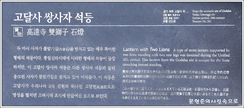 고달사터에 쓰러져 있었던 것을 1959년 경복궁으로 옮겨 왔으며, 현재는 국립중앙박물관에 있다. 높이는 2.43m이며 불을 밝히는 화사석(火舍石)까지만 남아있었으나, 2000년에 경기도 기전매장문화연구원이 실시한 발굴조사에서 지붕돌이 출토되었다.