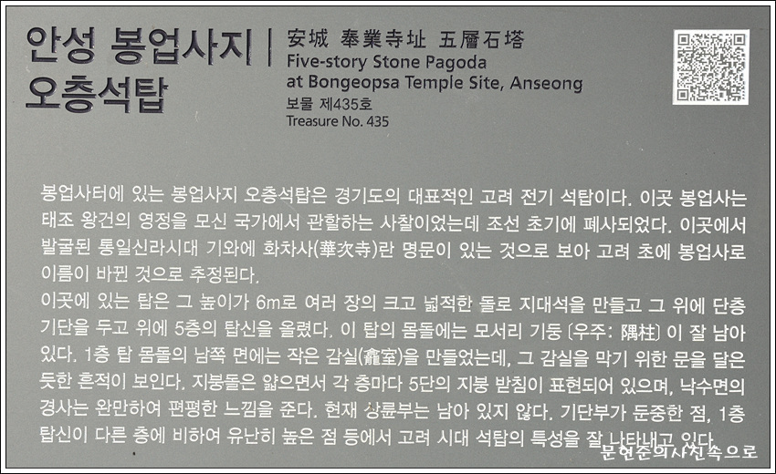 종 목 : 보물 제435호 명 칭 : 안성 봉업사지 오층석탑 (安城 奉業寺址 五層石塔) 분 류 : 유적건조물 / 종교신앙/ 불교/ 탑 수량/면적 : 1기 지정일 : 1966.02.28 소재지 : 경기 안성시 죽산면 죽산리 148-5번지..