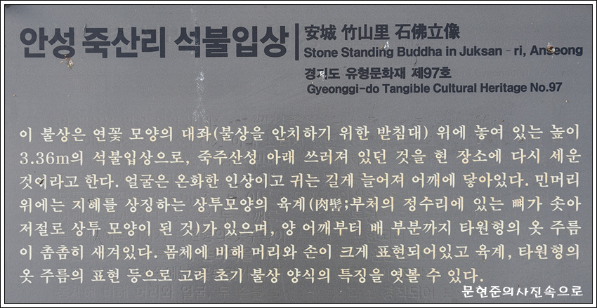 안성죽산리석불입상 원문 다운로드는 문화재청 에서 가능합니다 종 목 : 시도유형문화재 제97호 (경기) 수 량 : 1구 지정일 : 1980.06.02 소재지 : 경기 안성시 죽산면 죽산리 산6-2 소유자 : 국유 관리자 : 안성..