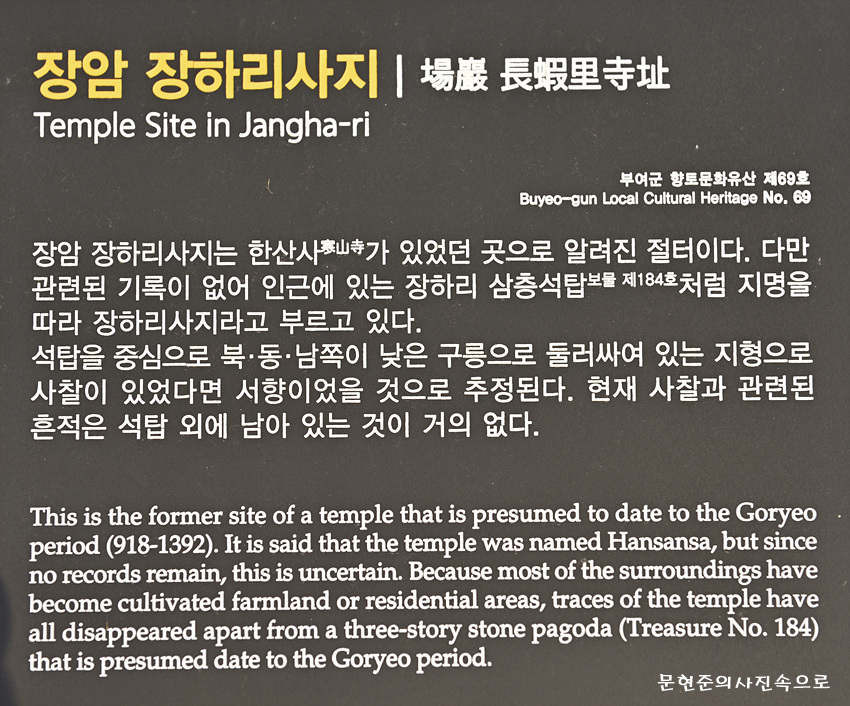종 목 : 보물 제184호 명 칭 : 부여 장하리 삼층석탑 (扶餘 長蝦里 三層石塔) 분 류 : 유적건조물 / 종교신앙/ 불교/ 탑 수 량 : 1기 지정일 : 1963.01.21 소재지 : 충남 부여군 장암면 장하리 536