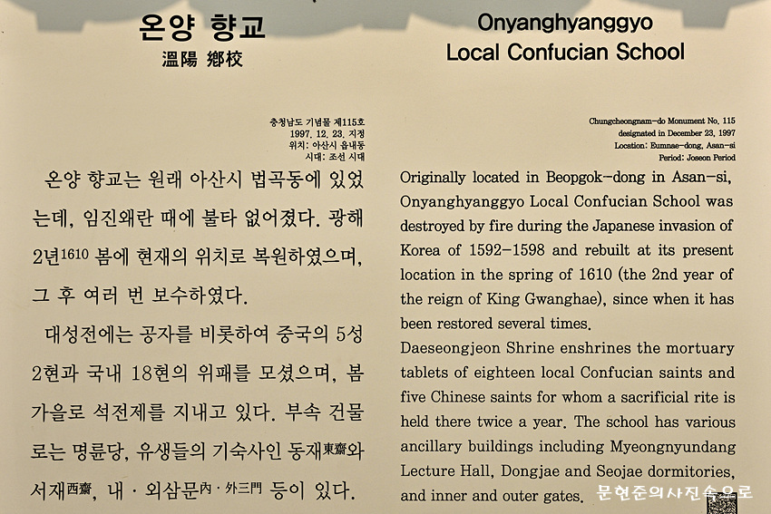 온양향교는 법곡동에 있었으나 임진왜란 때 소실되었고 그 뒤 광해군 2년(1610)에 지금 있는 자리로 옮겨 세웠다.