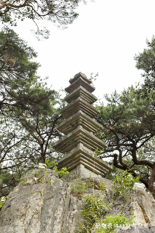 바위를 기단(基壇)삼아 7층의 탑신(塔身)을 올려놓은 이 탑은 바위와 탑이 만나는 부분이 조금 어긋나 있어 원래의 자리는 아닌 것으로 보인다. 탑신의 각 몸돌과 지붕돌은 각각 하나의 돌로 이루어져 있으며, 몸돌의 네 면에는 모서리마다 기둥을 본뜬 조각이 있다. 지붕돌은 1층부터 5층까지는 완만한 경사를 이루면서 처마의 선이 거의 직선을 이루고 있는 반면, 새로 만든 6층과 7층은 네 귀퉁이에서 심하게 들리고 밑면의 받침조각도 얇아서 서로 대조를 보이고 있다. 꼭대기에 있는 머리장식은 지극히 간략화된 모습이다.