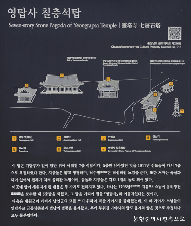 영탑사 법당 뒤의 바위 위에 서 있는 7층 석탑이다.