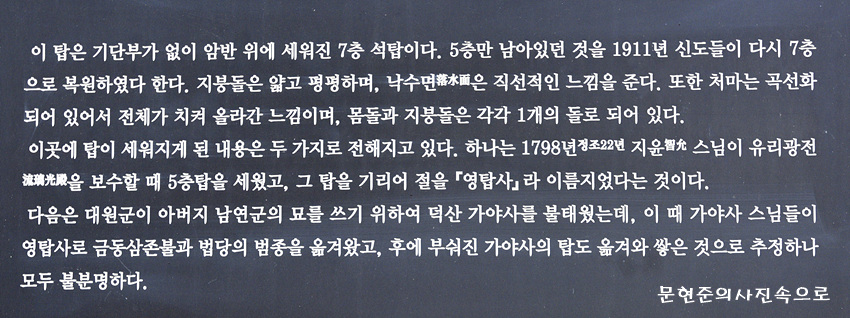 영탑사 법당 뒤의 바위 위에 서 있는 7층 석탑이다.