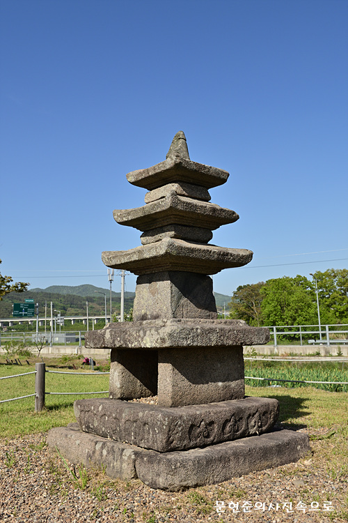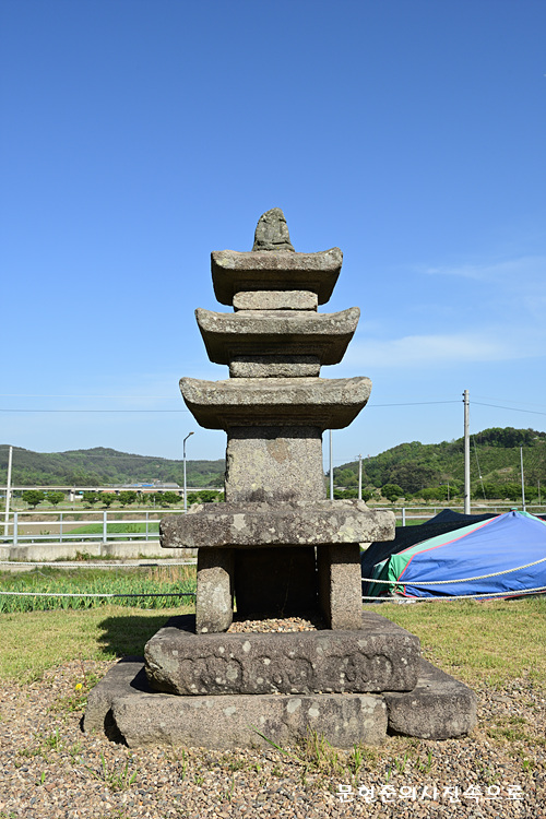 지석리에 있는 3층 석탑으로, 원래 마을 뒷산에 있었는데 일제시대 때 일본인들이 가져가려고 이곳까지 운반해 왔다가 주민들의 반발로 가져가지 못하여 이곳에 자리잡게 되었다.