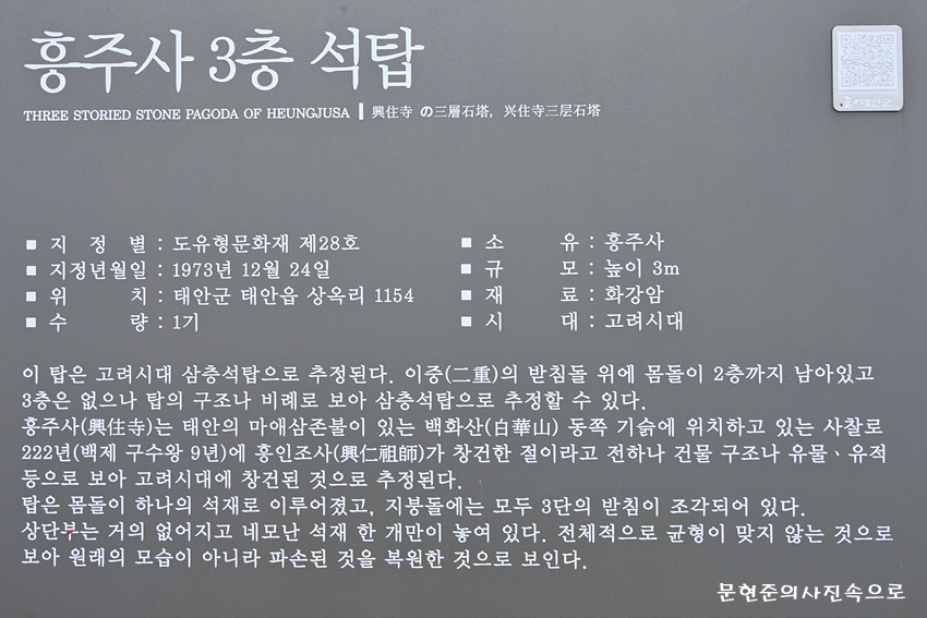 흥주사삼층석탑 종 목 : 충청남도 유형문화재 제28호 분 류 : 유적건조물 / 종교신앙/ 불교/ 탑 수 량 : 1기 지정일 : 1973.12.24 소재지 : 충남 태안군 태안읍 상옥리 1154 시 대 : 고려시대 소유자