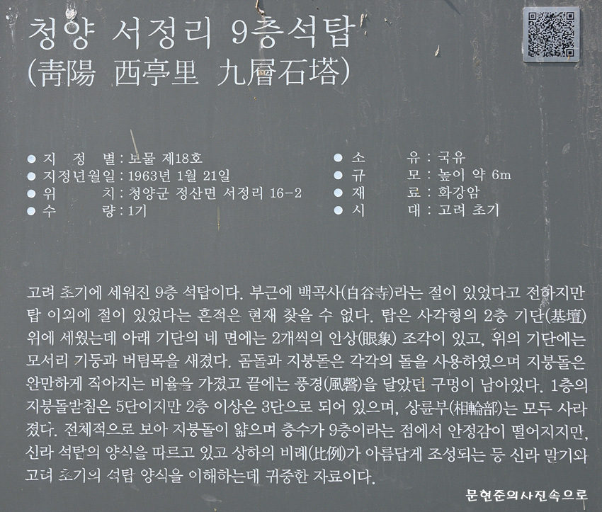 청양 서정리 구층석탑 (靑陽 西亭里 九層石塔)  종  목 : 보물 제18호  분  류 : 유적건조물 / 종교신앙/ 불교/ 탑  수  량 : 1기 지정일 : 1963.01.21 소재지 : 충남 청양군 정산면 서정리 16-2  시 .