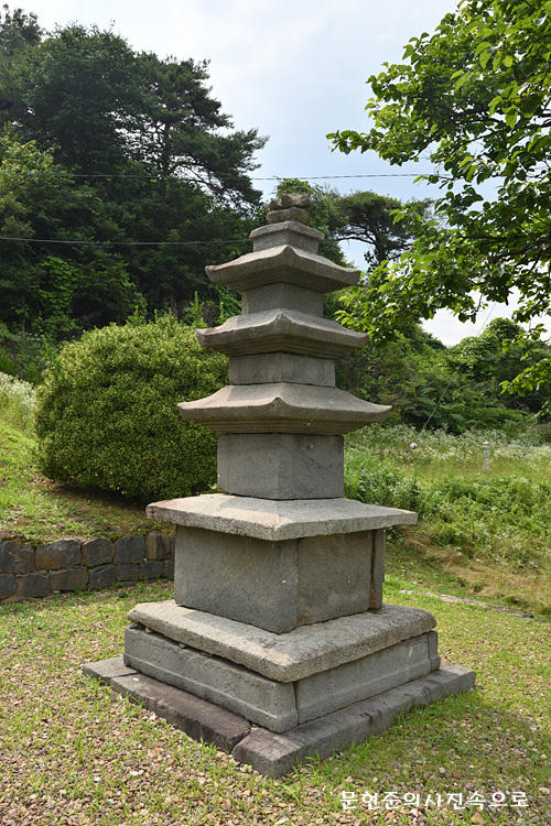 아래층 기단은 네 면의 가운데와 모서리에 기둥모양을 본떠 새겼고, 위층기단은 모서리에만 조각을 해 두었다. 탑신부의 각층 몸돌을 덮고있는 지붕돌은 곡선을 이루는 낙수면과 수평을 유지하는 처마의 조화가 아름답다. 네 귀퉁이에서의 들어올림도 가벼우며, 밑면의 받침은 1층에서부터 5단·4단·3단으로 점차 줄어들고 있다. 꼭대기에는 네모난 받침 위로 세 조각으로 깨어진 머리장식이 위태롭게 놓여있다.