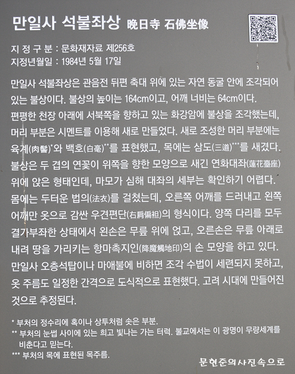 자연동굴안의 암벽에 조각한 좌상으로 정면이 서북쪽을 향하고 있는 석가여래상이다. 석가여래는 불교의 창시자인 석가모니 부처님을 형상화한 것으로 석가모니(釋迦牟尼)란 '석가족의 성자'라는 뜻이다. 부처의 머리부분은 육계(肉계)가 없이 둥글게 되어 있고, 이마에는 흰 유리 구슬로 백호(白毫)를 끼웠다. 얼굴의 모습은 눈을 감은 형태에 귀가 길고 코도그리 높지 않게 표현하였다. 목에는 삼도(三道)의 표현이 있는데 머리부분은 잘려 나갔던 덧을 거두어서 다시 붙인 것이다. 만일사의 석탑이나 마애불에 비하면 조각이나 수법이 세련되지 못하였다. 불상의 양식이나 주변의 유물로 보아 고려시대의 작품으로 짐작된다.자연동굴안의 암벽에 조각한 좌상으로 정면이 서북쪽을 향하고 있는 석가여래상이다. 석가여래는 불교의 창시자인 석가모니 부처님을 형상화한 것으로 석가모니(釋迦牟尼)란 '석가족의 성자'라는 뜻이다. 부처의 머리부분은 육계(肉계)가 없이 둥글게 되어 있고, 이마에는 흰 유리 구슬로 백호(白毫)를 끼웠다. 얼굴의 모습은 눈을 감은 형태에 귀가 길고 코도그리 높지 않게 표현하였다. 목에는 삼도(三道)의 표현이 있는데 머리부분은 잘려 나갔던 덧을 거두어서 다시 붙인 것이다. 만일사의 석탑이나 마애불에 비하면 조각이나 수법이 세련되지 못하였다. 불상의 양식이나 주변의 유물로 보아 고려시대의 작품으로 짐작된다.