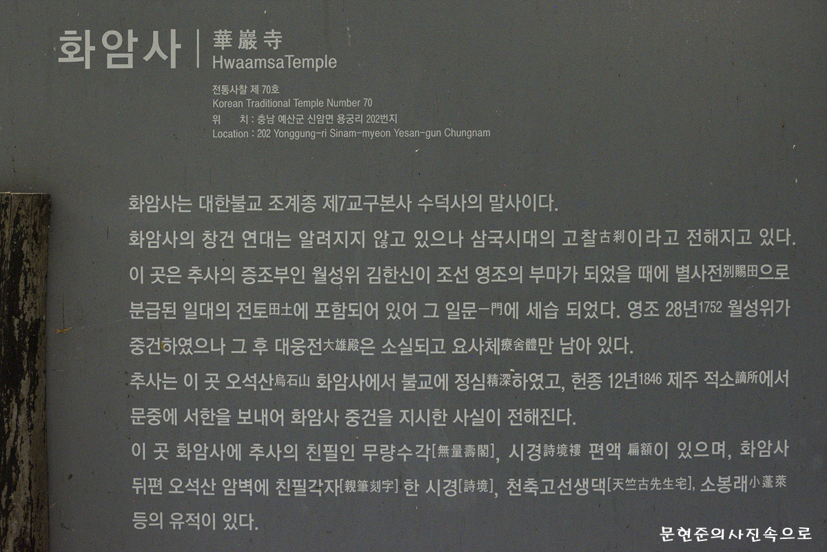 이곳 화암사에 추사의 친필인 무량수각,시경,편액이 있으며.호암사 뒤편 오석산 암벽에 친필각자한 시경,천축고선생댁,소봉래등의 유적이 있다.