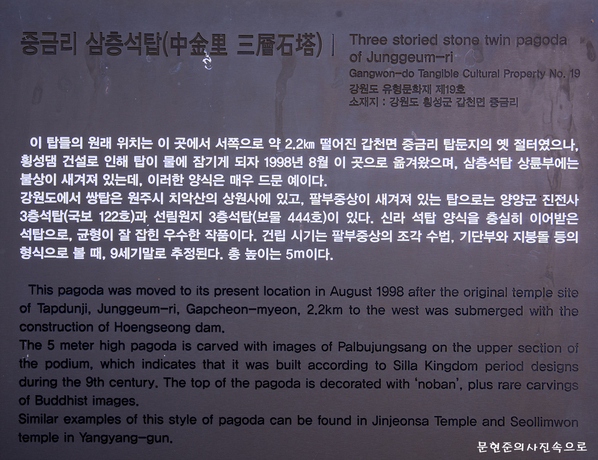 이 탑들의 원래 위치는 이 곳에서 서쪽으로 약 2.2Km 떨어진 중금리 답둔지의 옛 절터였으나,횡성댐 건설로 인해 탑이 물에 잠기게 되자 1998년 8월 이 곳으로 옮겨 왔으며, 삼층석탑 상륜부에는 불상이 새겨져 있는데, 이런한 양식은 매우 드문 예이다.