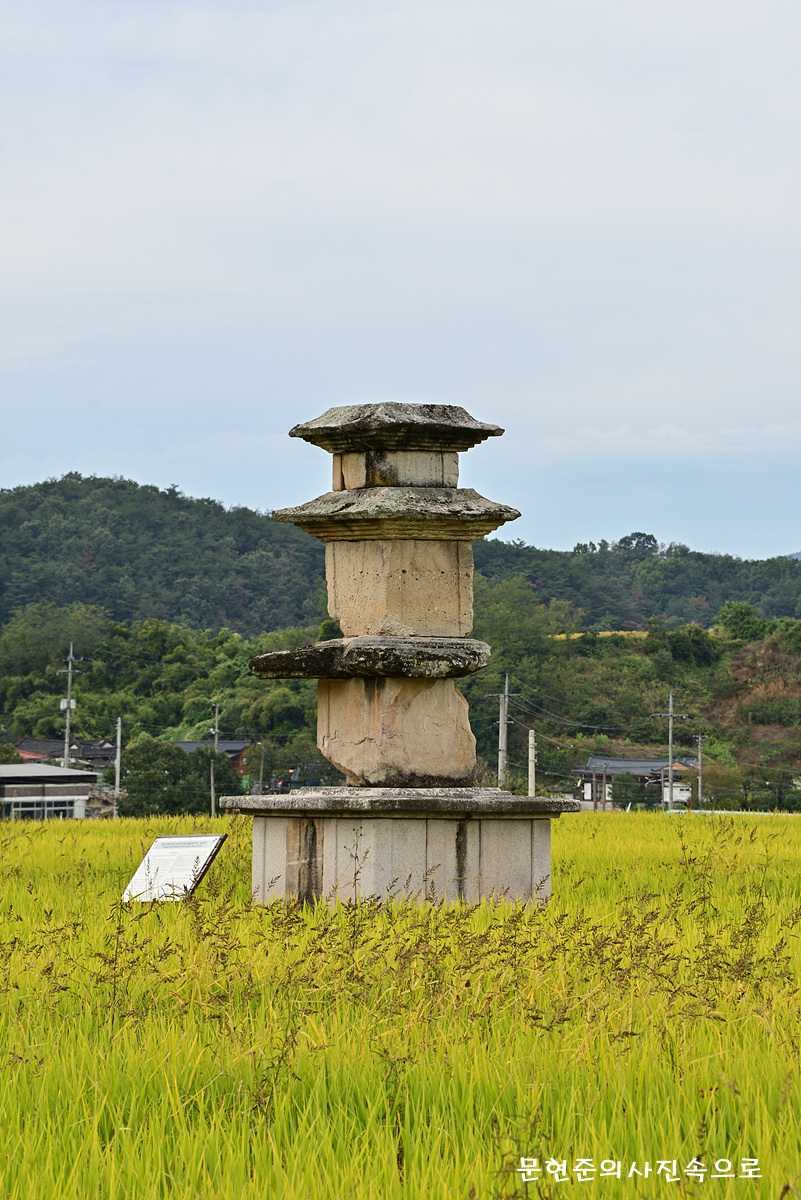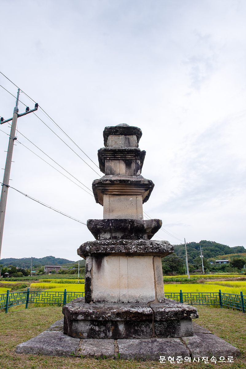 마을 앞 논 가운데 자리하고 있으며, 탑이 속해있던 절의 역사는 전하는 것이 없다. 전체적인 모습은 2층 기단(基壇) 위에 3층의 탑신(塔身)을 올린 형태이다.