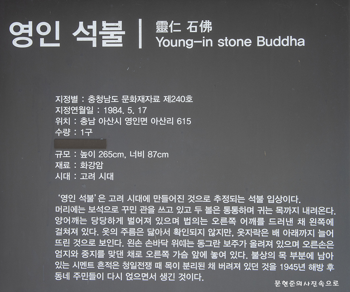 충청남도 분화재자료 제240호 영인석불 분 류 : 유물 / 불교조각 / 석조 / 불상 수량/면적 : 1구 지정(등록)일 : 1984.05.17 소재지 : 충청남도 아산시 자 료 : 국가문화유산포탈 충청남도 아산시 영인면