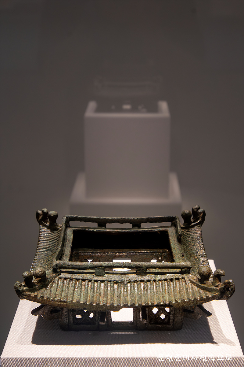 뚜껑에는 23개의 산들이 4~5겹으로 첩첩산중을 이루는 풍경을 보여주고 있다. 피리와 소비파, 현금, 북들을 연주하는 5인의 악사와 각종 무인상, 기마수렵상 등 16인의 인물상과 봉황, 용을 비롯한 상상의 날짐승, 호랑이, 사슴 등 39마리의 현실 세계 동물들이 표현되어 있다. 이 밖에 6개의 나무와 12개의 바위, 산 중턱에 있는 산길, 산 사이로 흐르는 시냇물, 폭포, 호수 등이 변화무쌍하게 표현되어 있다.