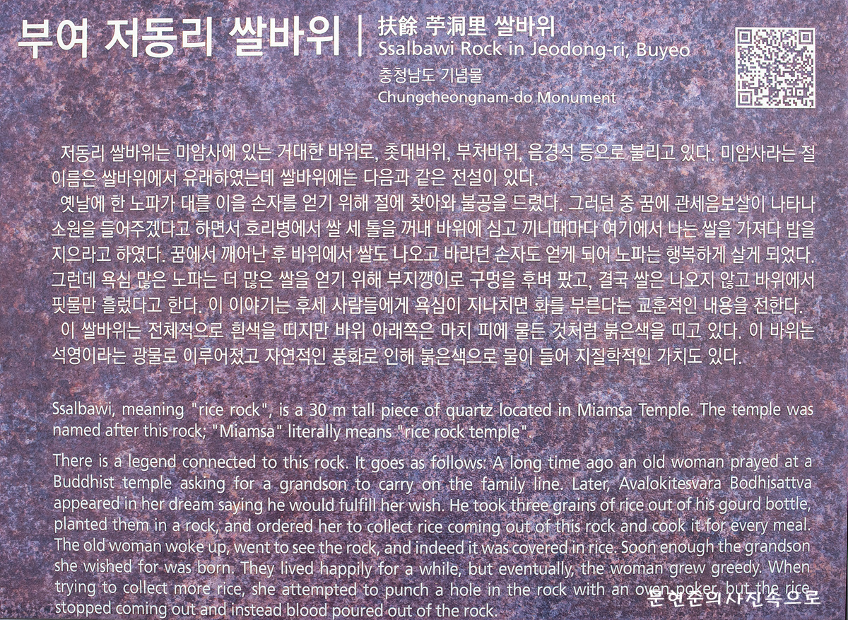 충남 부여군 미암사 내에 있는 높이 30m의 거대한 자연석 바위로 일명 ‘쌀바위’라 불리는데, 이렇게 불리는 데에는 다음과 같은 이야기가 전한다.