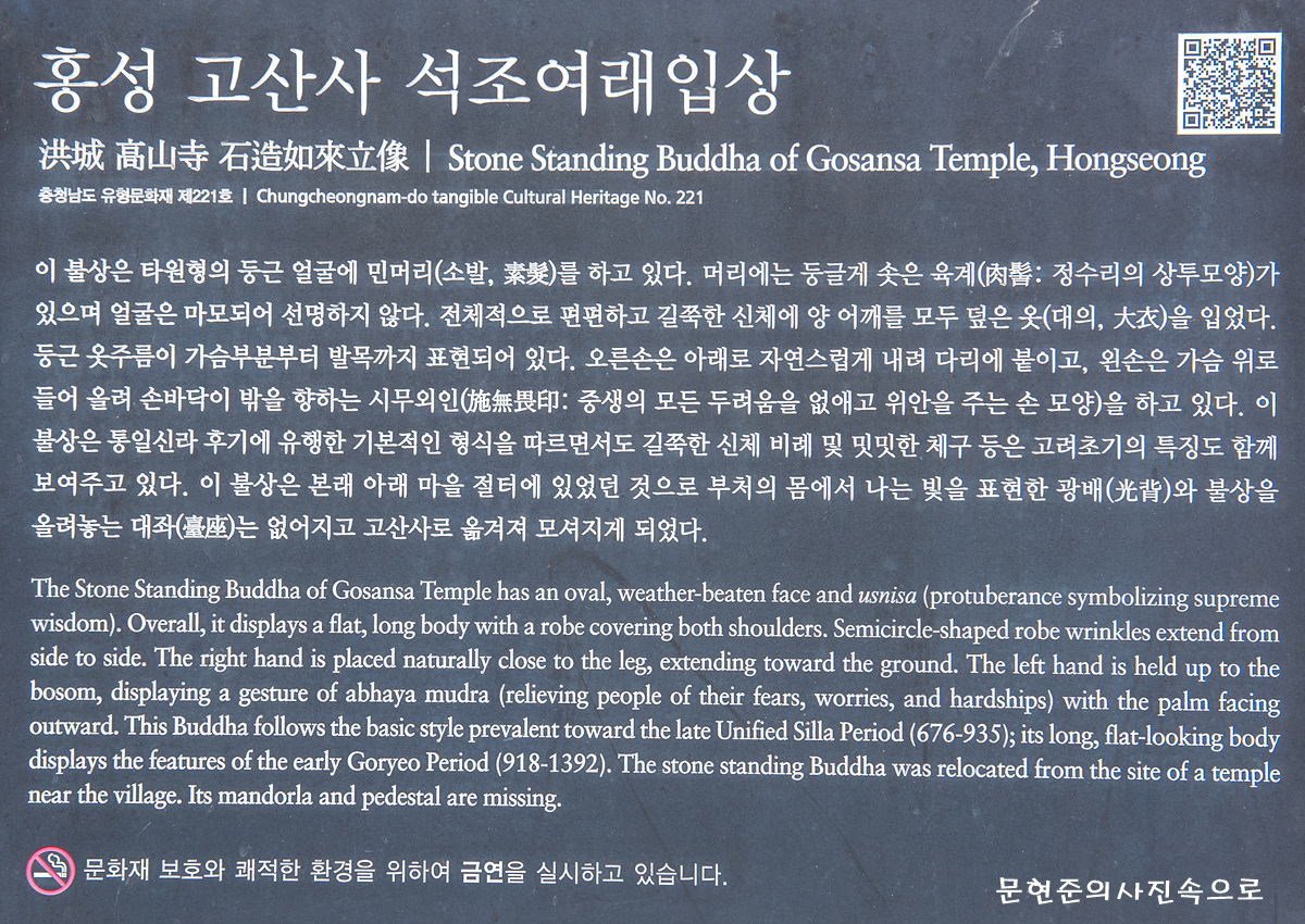 충청남도 유형문화재 제221호 홍성 고산사 석조여래입상 (洪城 高山寺 石造如來立像) 분 류 : 유물 / 불교조각 / 석조 / 불상 수량/면적 : 1구 지정(등록)일 : 2013.04.10 소재지 : 충청남도 홍성군 자
