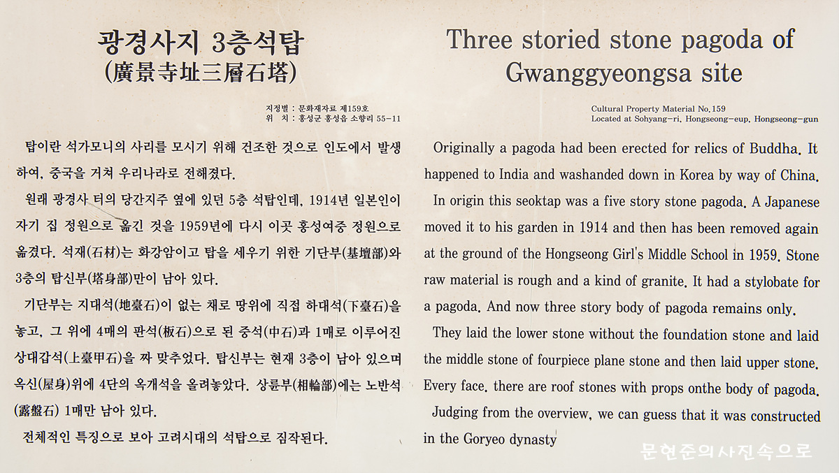 충청남도 문화재자료 제159호 광경사지삼층석탑 분 류 : 유적건조물 / 종교신앙 / 불교 / 탑 수량/면적 : 1기 지정일 : 1984.05.17 소재지 : 충남 홍성군 홍성읍 소향리 34번지 자 료 : 국가문화유산포털