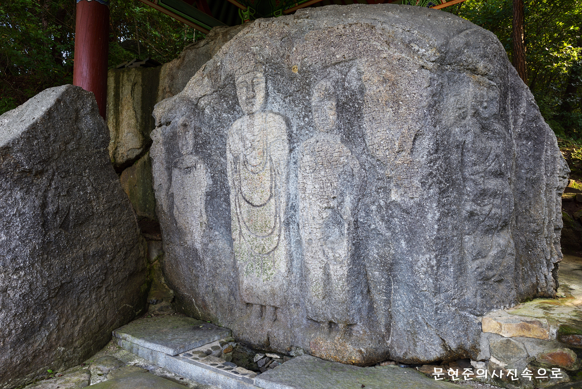 중앙에 본존불과 좌우에 보살을 조각한 1면이 있고 그 암반의 북면에 여래입상이 별도로 새겨졌다. 삼존불이 있는 바위의 남쪽 앞 정면 삼각형의 바위에는 한쪽 다리만 올리고 생각하는 자세로 앉아 있는 반가사유상이 조각되어 있다.