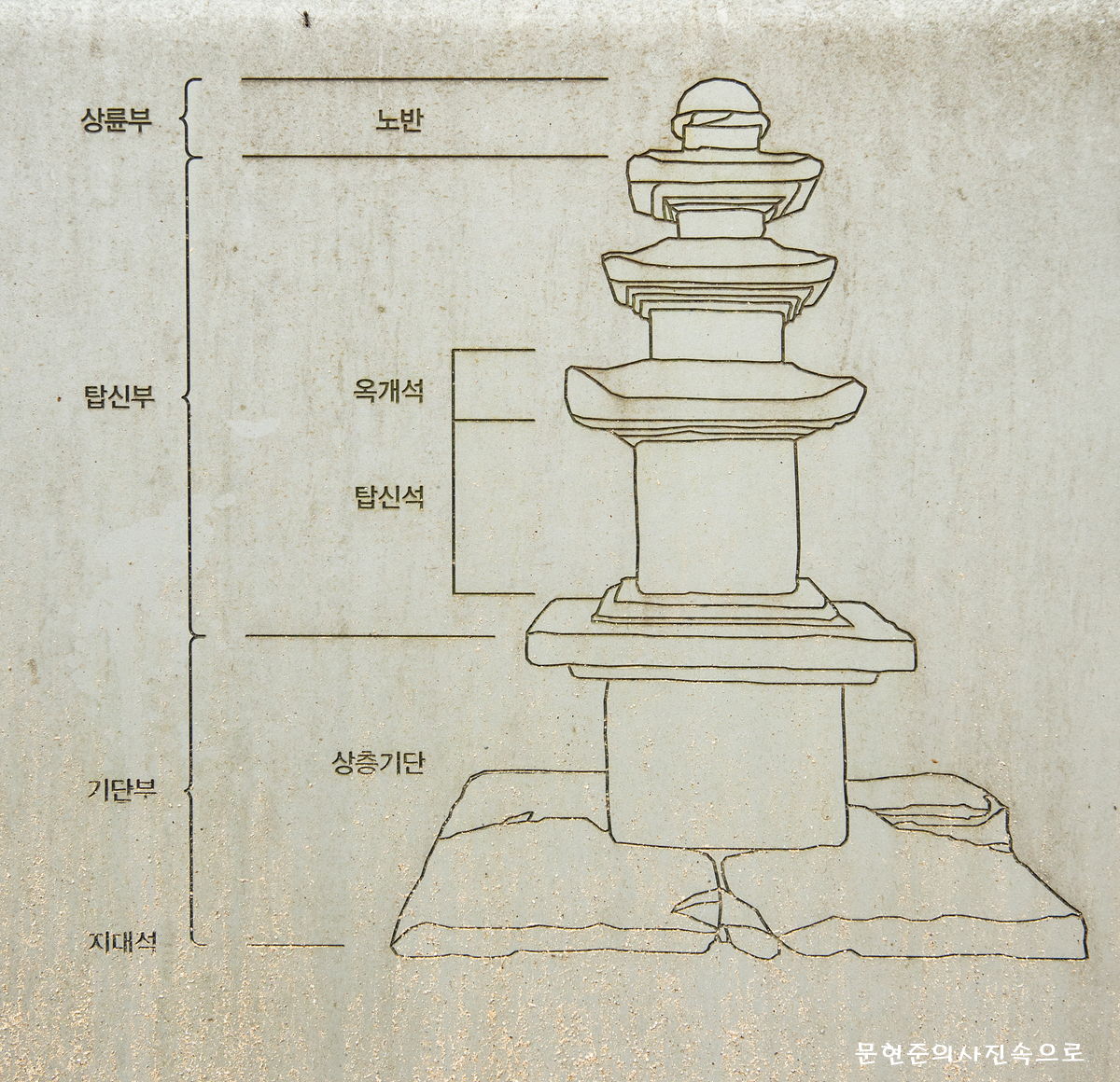 4개의 판으로 구성된 받침돌 위에 단층의 기단*을 만들고 3층으로 이루어진 몸돌을 그 위에 올려놓았는데, 원래는 5층이었으나 일부 훼손되어 지금은 3층만 남게 된 것으로 추정된다.