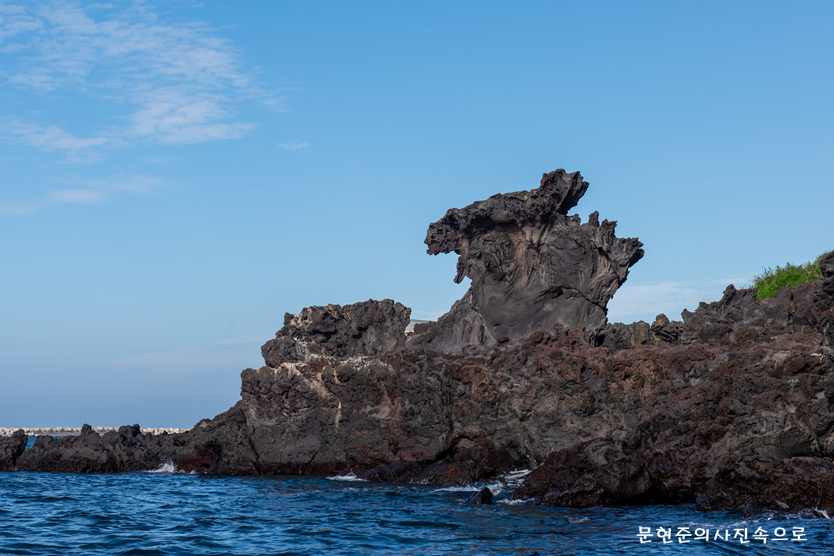 용두암은 옆에서 보면 용머리의 모습이지만, 위에서 보면 얇은 판을 길게 세워 놓은 모습이다.