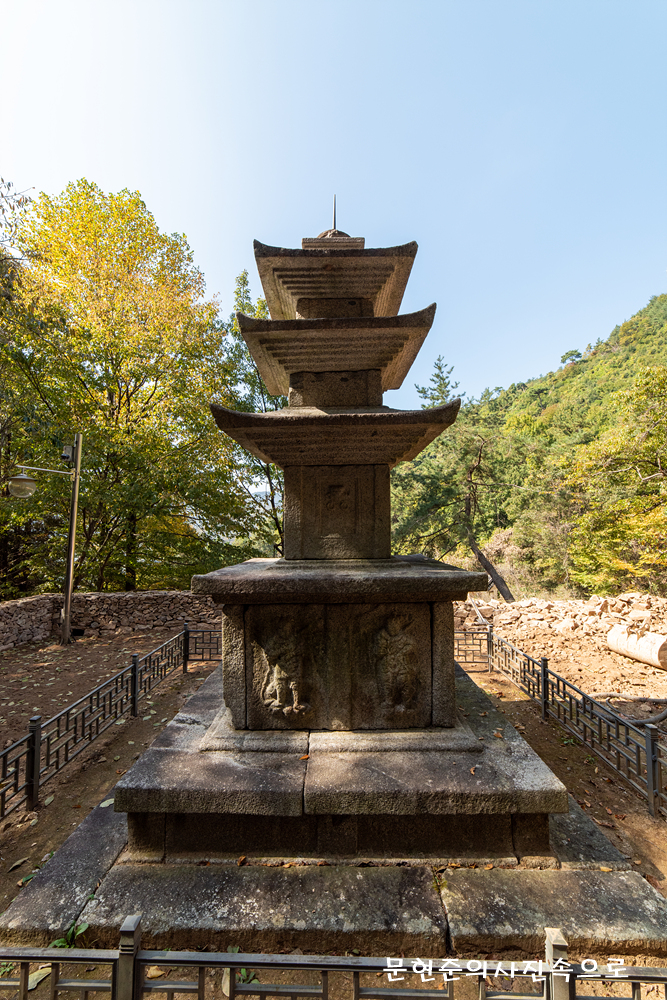 통일신라시대의 전형양식을 갖추고 있어 9세기경에 조성된 것으로 추측된다. 1층 몸돌에 공양상이 새겨져 있는 점은 특이한 예이며, 각 부의 비례도 좋고 조각수법이 세련된 석탑이다. 탑의 뒤편에는 석불입상(石佛立像)이 있는데, 이들은 서로 연관된 의미를 지니고 있을 것으로 보인다.