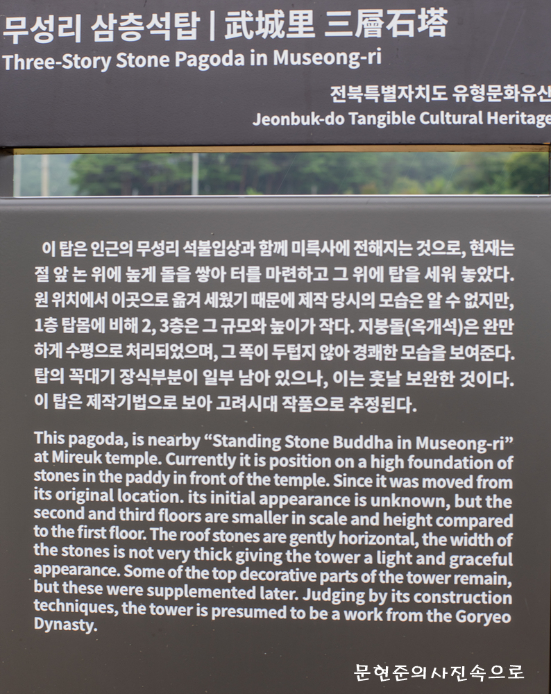 이 탑은 인근의 무성리석불입상과 함께 미륵사에 전해지는 것으로,현재는 절 앞 논위에 높게 돌은 쌓아 터를 마련하고 그위에 탑을 세워 놓았다.