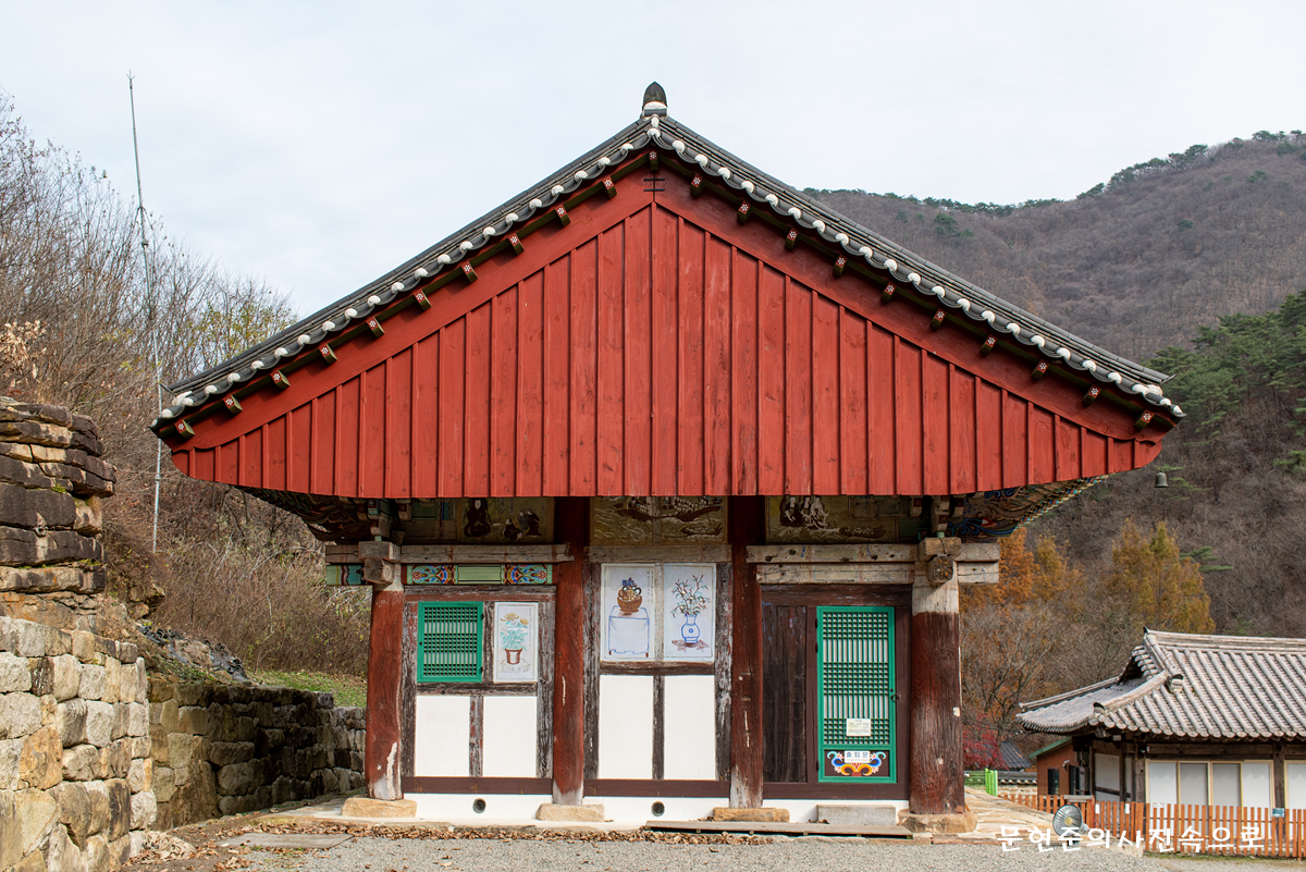 건물의 바깥쪽 벽에는 여래상을 그려 장엄하게 하였으며, 내부에는 천장 좌우에 문수보살과 보현보살의 불화가 있다. 중앙에는 용 등으로 장식하여 내부를 세련되고 우아하게 하였다.