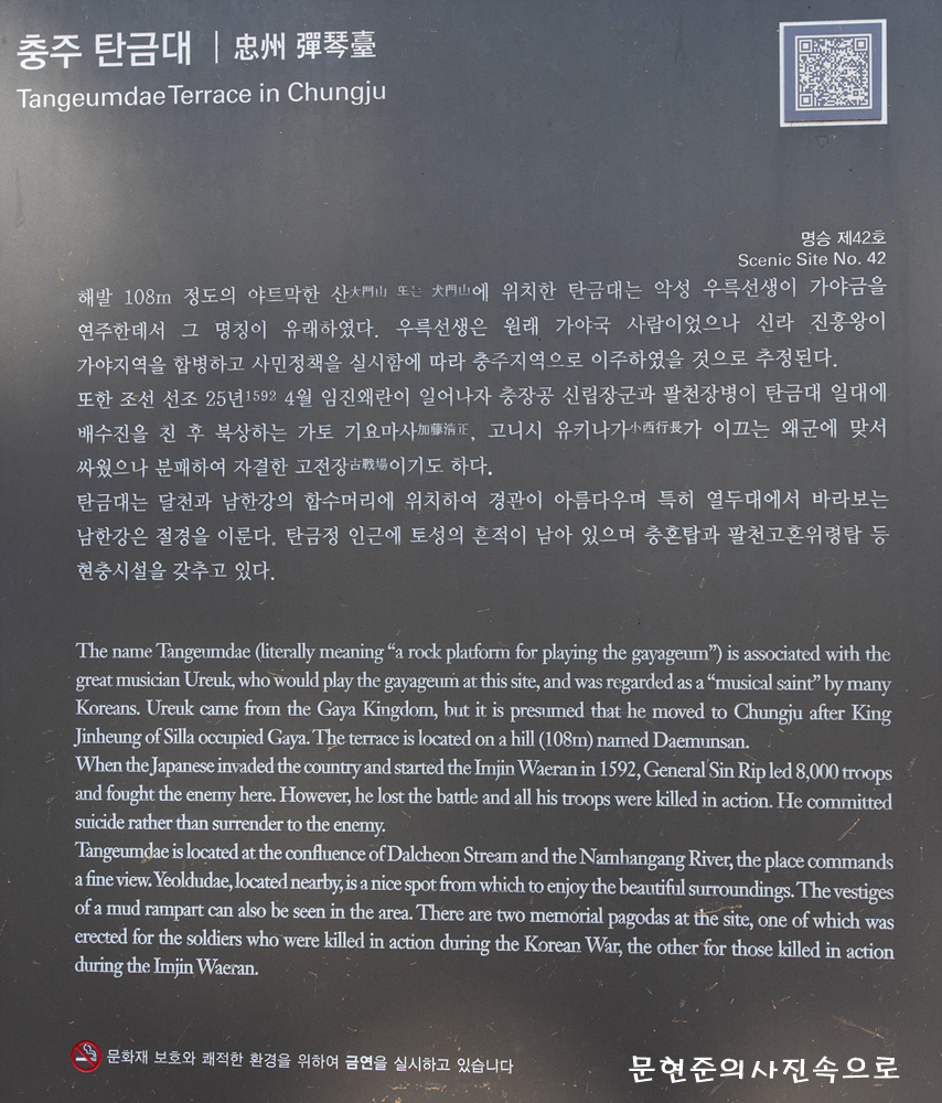 충주 탄금대는 우리나라 3대 악성 중 하나인 우륵이 가야금을 연주하던 곳이라 하여 탄금대란 명칭이 붙은 곳이며 임진왜란 때 신립장군이 소서행장과 맞서 싸우다 패전하자 투신한 곳으로 역사적 가치가 큰 명소이다.
