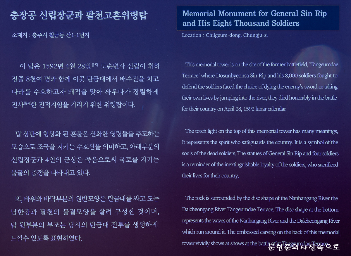 충주 탄금대는 우리나라 3대 악성 중 하나인 우륵이 가야금을 연주하던 곳이라 하여 탄금대란 명칭이 붙은 곳이며 임진왜란 때 신립장군이 소서행장과 맞서 싸우다 패전하자 투신한 곳으로 역사적 가치가 큰 명소이다.
