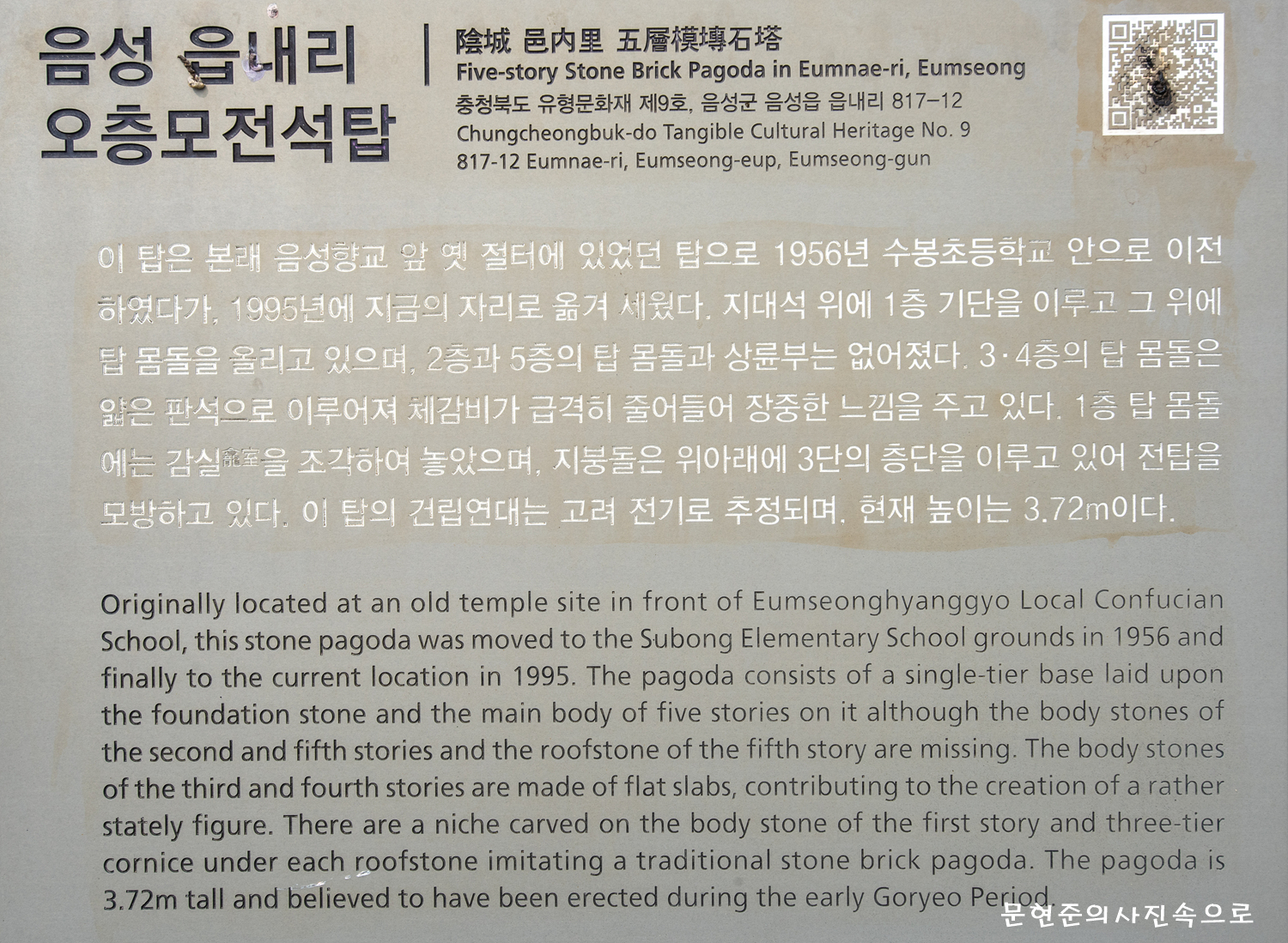 음성오층모전석탑 (陰城五層模塼石塔) 종 목 : 충청북도 유형문화재 제9호 분 류 : 유적건조물 / 종교신앙/ 불교/ 탑 수 량 : 1기 지정일 : 1975.08.20 소재지 : 충북 음성군 음성읍 읍내리 817-12 시 대 :