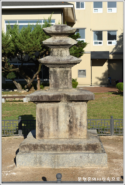 널찍한 돌 2장이 놓여 있고 그 위로 기단과 탑신부가 있는 상태이다. 기단 가운뎃돌의 각 모서리에 기둥모양을 새겨두었으며 가운데에도 기둥조각을 두었다. 기단을 마감하는 맨 윗돌은 윗면에 약간의 경사가 있다.