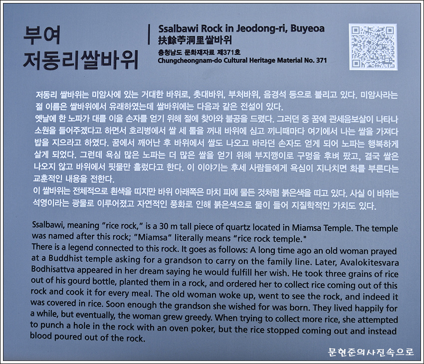 예전에 한 노파가 대를 이을 손자를 얻기 위하여 미암사라는 절에 찾아와 지성으로 불공을 드렸다. 그러던 중 꿈에 관세음 보살이 나타나 호리병에서 쌀 세톨을 꺼내어 바위에 심고 끼니 때마다 여기서 나는 쌀을 가져다 밥을 지으라고 하였다. 노파가 꿈에서 깨어보니 바위에서 쌀이 나오고 바라던 손자도 얻게 되어 행복하게 살았다. 그러나 그 후 욕심이 생긴 노파는 더 많은 쌀을 얻기 위해 부지깽이로 구멍을 후벼 파고 말았으며 그 후로 더 이상 쌀은 나오지 않고 주변에 핏물이 흘렀다고 한다.