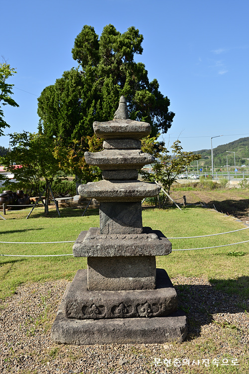 지석리에 있는 3층 석탑으로, 원래 마을 뒷산에 있었는데 일제시대 때 일본인들이 가져가려고 이곳까지 운반해 왔다가 주민들의 반발로 가져가지 못하여 이곳에 자리잡게 되었다.