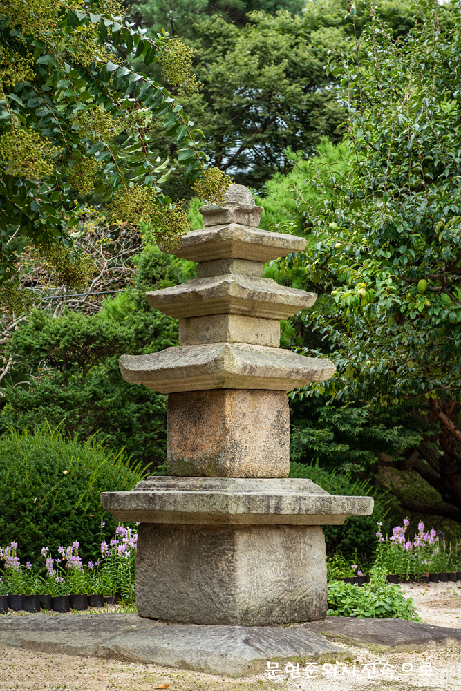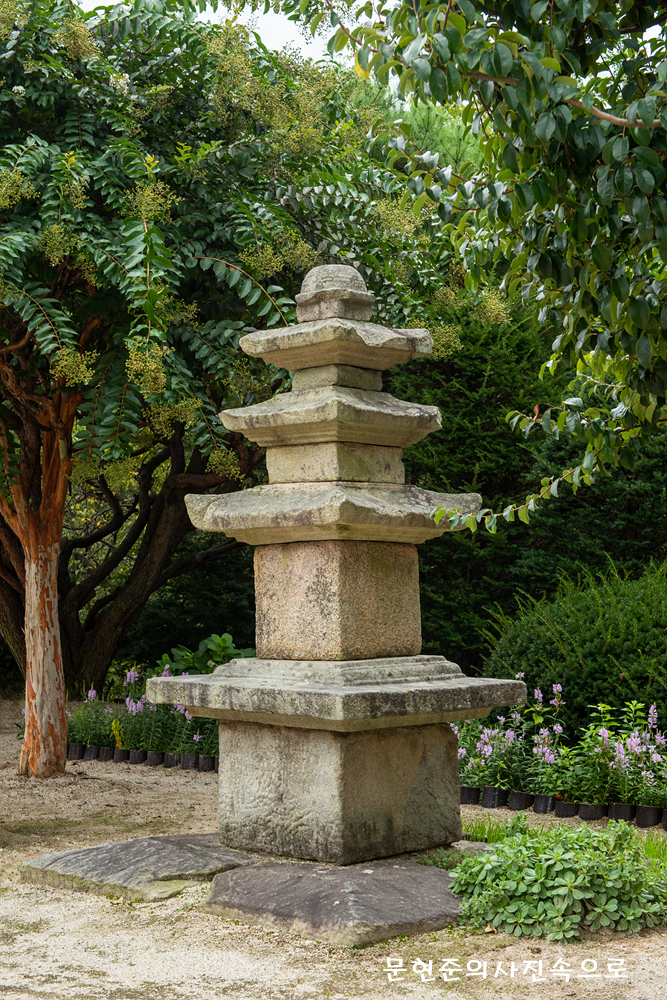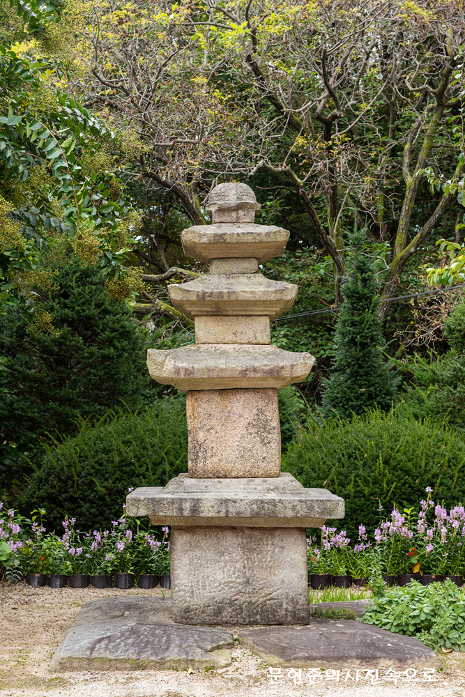 4개의 판으로 구성된 받침돌 위에 단층의 기단*을 만들고 3층으로 이루어진 몸돌을 그 위에 올려놓았는데, 원래는 5층이었으나 일부 훼손되어 지금은 3층만 남게 된 것으로 추정된다.