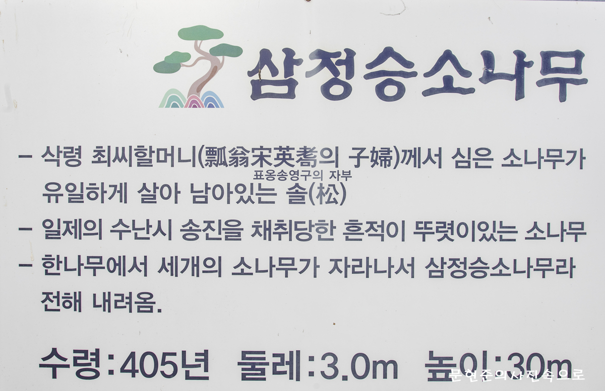삼정승 소나무 는 삭령 최씨할머니(표옹송영구의 자부)께서 심은 소나무가 유일하게 살아 남아있는 솔로, 일제의 수난시 송진을 채취당한 흔적이 뚜렷이있는 소나무로 한나무에서 세개의 소나무가 자라나서 삼정승소나무라 번해 내려온다. (수령405년, 둘레3.0m 높이30m)